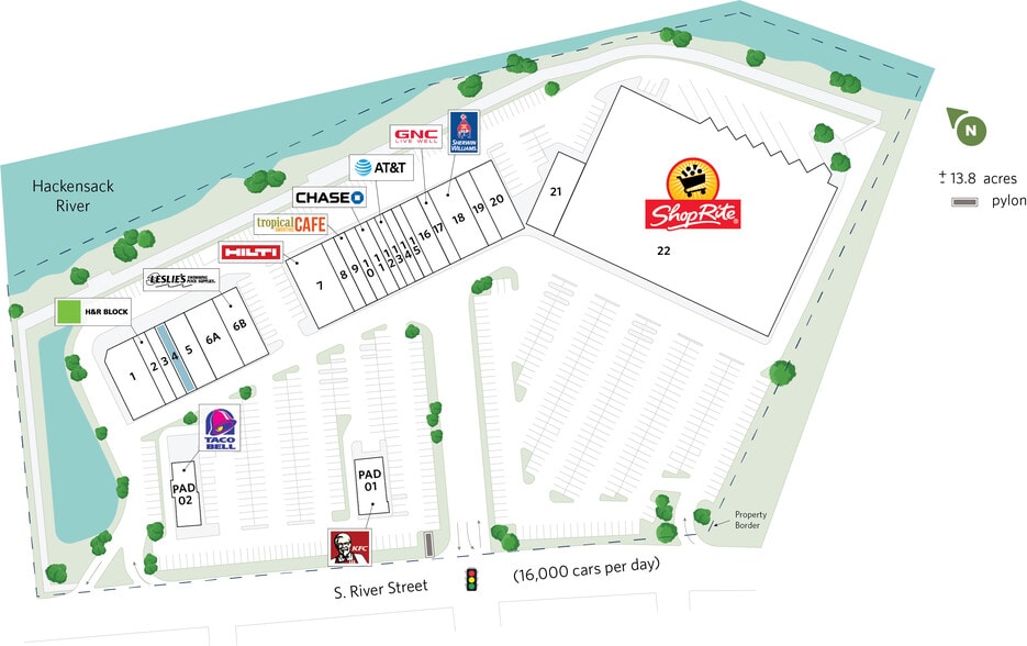 Riverfront Plaza is a 128,922 square-foot ShopRite anchored center just west of New York City in Hackensack, NJ. Positioned at a signalized intersection along River Road, the center benefits from an extremely captive audience that is slated to grow with 2,500+ apartments and condominiums currently under development within one mile. 200,000 people live within a three-mile radius of the center with an average household income of $113,000.